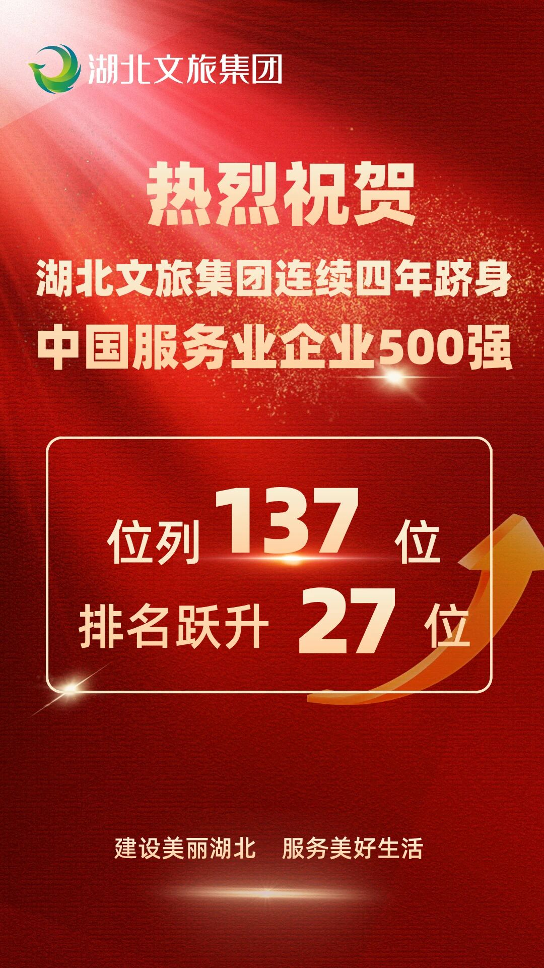 湖北文旅集團再上榜中國服務業企業500強,排名第137位。9月18日,中國企業聯合會、中國企業家協會在重慶發布“2025中國服務業企業500強”榜單。湖北文旅集團憑借2024年604.80億元的營業收入,再度躋身榜單,實現連續四年上榜,排名第137位,較2024年躍升27個位次。近年來,集團聚焦“四化轉型”,系統推進“穩增長、調結構、新產品、盤存量”四大行動,加速構建主業突出、鏈條完整、效能卓越的文旅現代產業體系,為湖北建設世界知名文化旅游目的地貢獻力量。