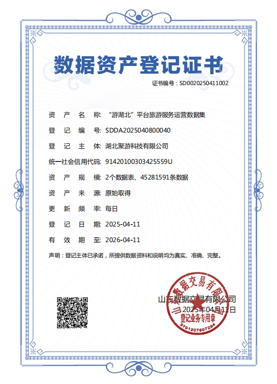 近日,湖北數字文旅集團旗下聚游科技公司在數據資產化領域傳來捷報。4月11日,其研發的"游湖北平臺旅游服務運營數據集"成功取得數據資產登記認證。